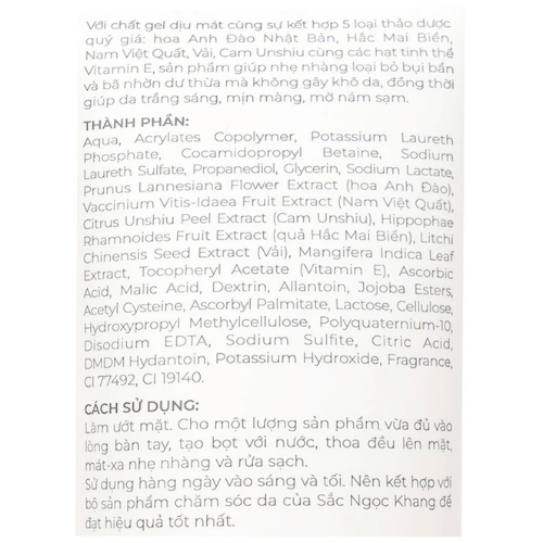 Liệu trình: Sử dụng đều đặn 2 lần/ngày (sáng và tối). Nên kết hợp cùng Kem Sắc Ngọc Khang hoặc Serum Sắc Ngọc Khang để có kết quả mờ nám tốt nhất.